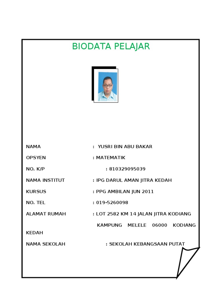 Beliau dilahirkan pada 29 Ogos 2004 jam 855 malam di hospital besar Kuala Terengganu. Umumnya biodata dibuat sepanjang 1-2 halaman dan diperuntukkan untuk berbagai keperluan. Nah untuk melengkapi isi dari pembahasan kita kali ini maka mari kita simak ulasan selengkapnya.